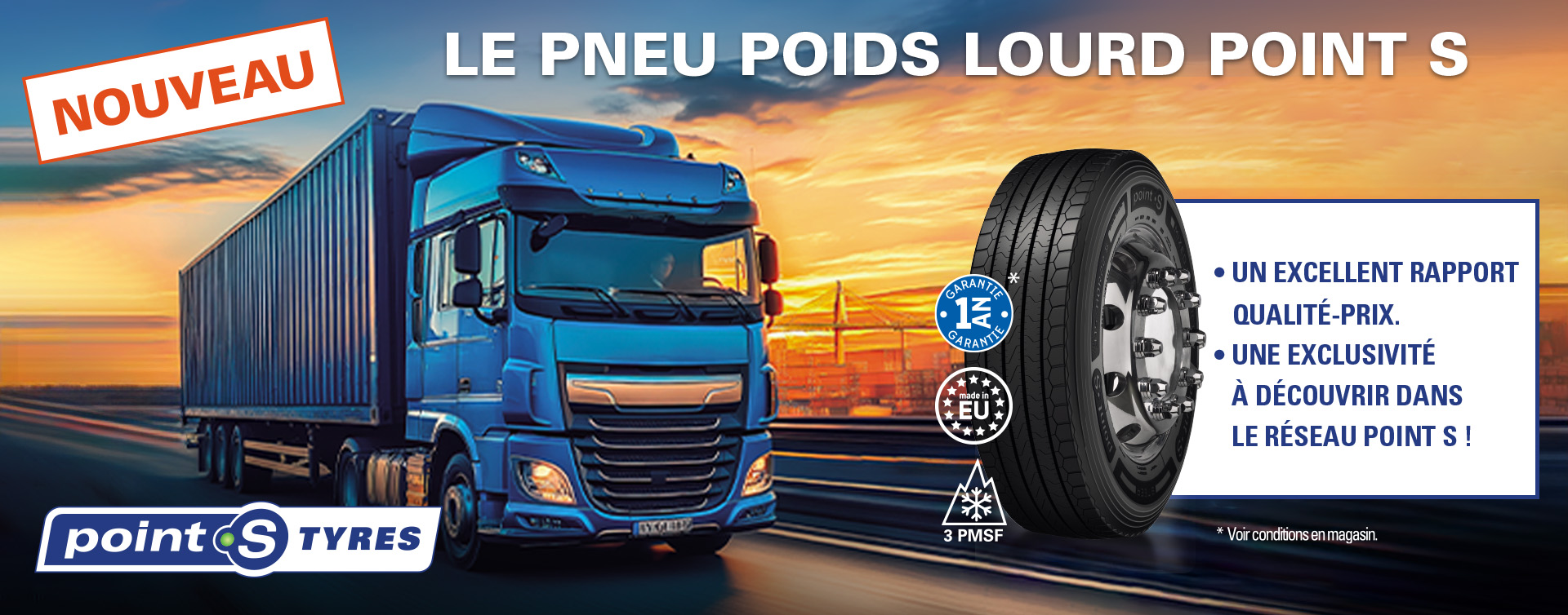 Découvrez Point S Tyres Truck, notre toute nouvelle gamme de pneus poids lourd conçue pour répondre aux exigences des professionnels du transport. Recreusable, rechapable et conçue pour optimiser vos rendements, cette gamme s’inscrit dans une démarche responsable et performante.
